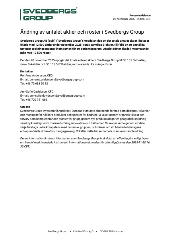 Svedbergs Group AB (publ) (”Svedbergs Group”) meddelar idag att det totala antalet aktier i bolaget ökade med 12 500 aktier under november 2025, varav samtliga B-aktier, till följd av att anställda utnyttjat teckningsoptioner inom ramen för ett optionsprogram. Antalet röster ökade i motsvarande mån med 12 500 röster.