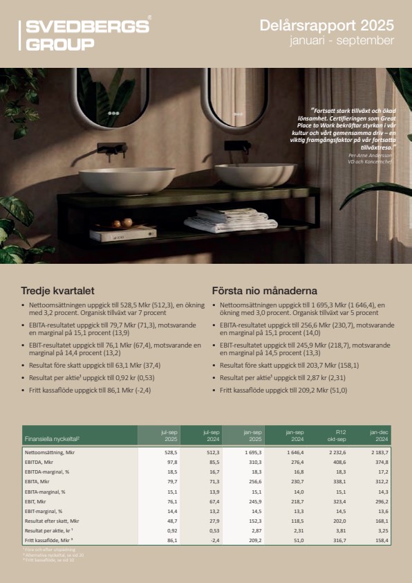 Denna information är sådan information som Svedbergs Group är skyldigt att offentliggöra enligt EU:s marknadsmissbruksförordning. Informationen lämnades, genom ovanstående kontaktpersoners försorg, för offentliggörande den 2025-10-29 07:30 CET.