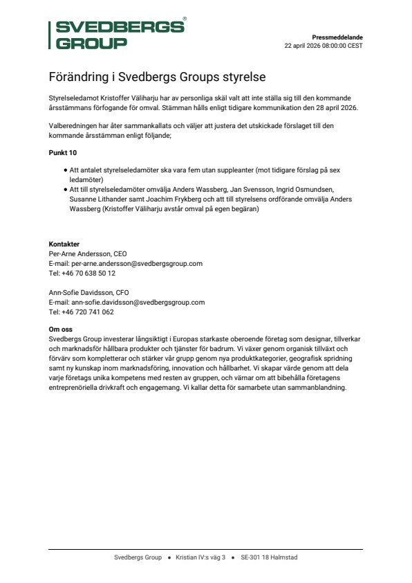 Styrelseledamot Kristoffer Väliharju har av personliga skäl valt att inte ställa sig till den kommande årsstämmans förfogande för omval. Stämman hålls enligt tidigare kommunikation den 28 april 2026.
