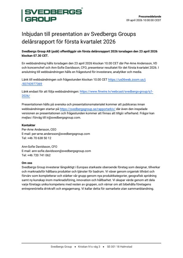 Svedbergs Group AB (publ) offentliggör sin första delårsrapport 2026 torsdagen den 23 april 2026 klockan 07.30 CET.