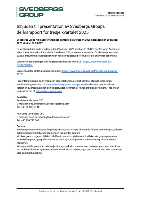Länk endast för att följa webbsändningen: https://www.finwire.tv/webcast/svedbergs-group/q3-2025/