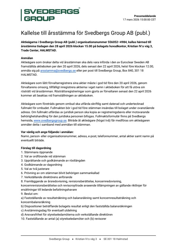 Aktieägarna i Svedbergs Group AB (publ.) organisationsnummer 556052–4984, kallas härmed till årsstämma tisdagen den 28 april 2026 klockan 15.00 på bolagets huvudkontor, Kristian IV:s väg 3, Trade Center, HALMSTAD.