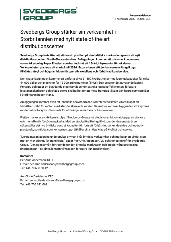 Svedbergs Group fortsätter att stärka sin position på den brittiska marknaden genom ett nytt distributionscenter i South Gloucestershire. Anläggningen kommer att drivas av koncernens varumärkesbolag Roper Rhodes, som har tecknat ett 15-årigt hyresavtal för lokalerna. Verksamheten planeras att starta i juli 2026. Expansionen stödjer koncernens långsiktiga tillväxtstrategi och höga ambition för operativ excellens och förbättrad kundservice.