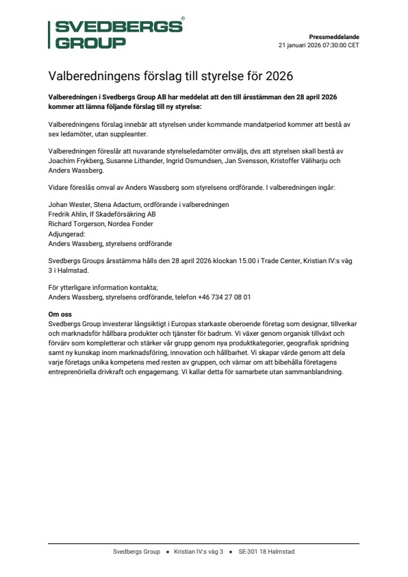 Valberedningen i Svedbergs Group AB har meddelat att den till årsstämman den 28 april 2026 kommer att lämna följande förslag till ny styrelse: